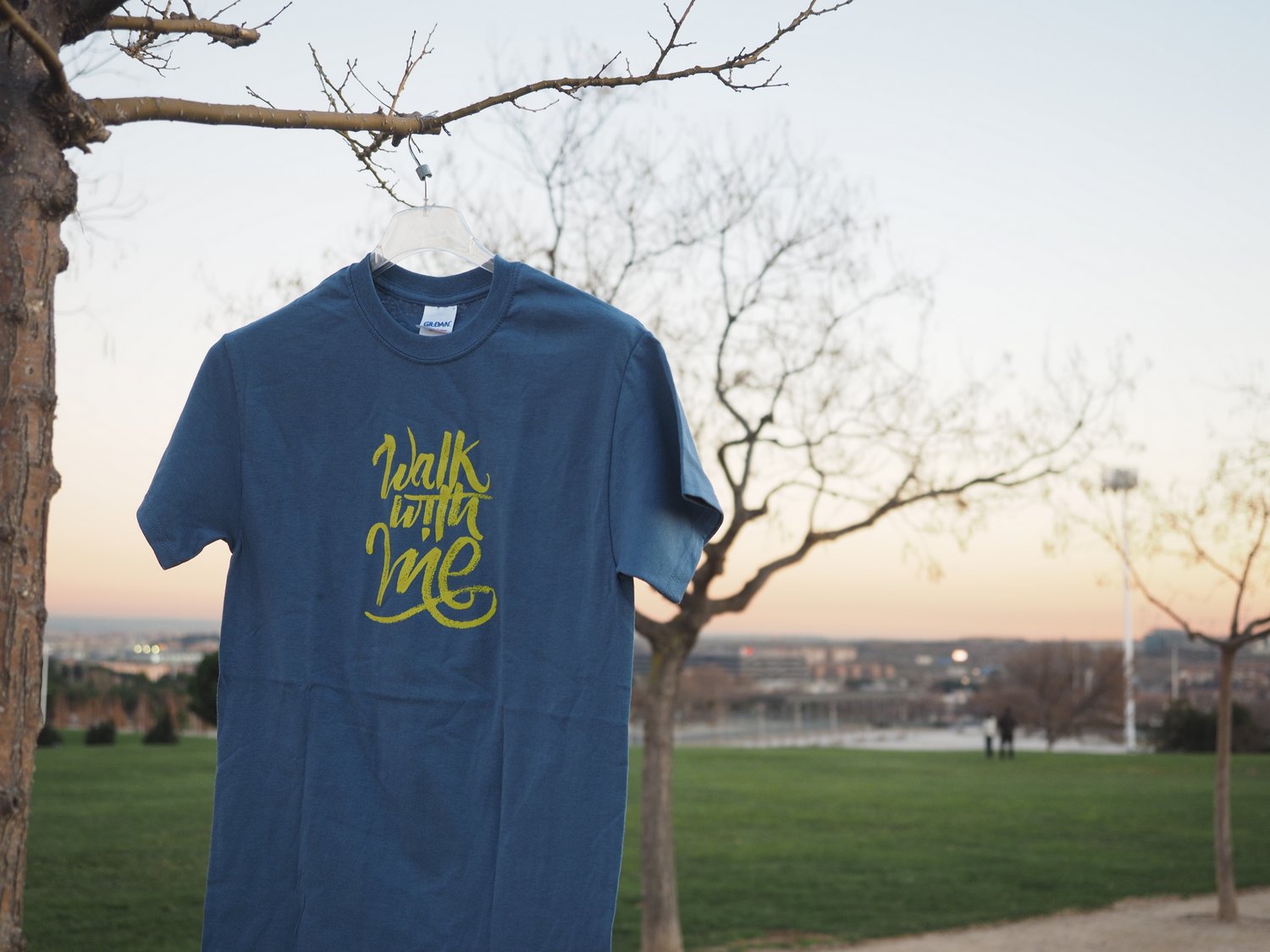Camiseta Walk With Me azul, letras lima | unisex